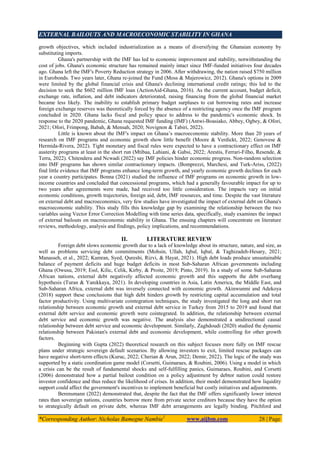 1) The document examines the influence of external bailouts on macroeconomic stability in Ghana from 2008 to 2021 using time series data and vector error correction modeling.