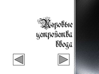 Документ описывает различные устройства ввода, включая клавиатуры, мыши, сканеры и микрофоны, а также их функции и особенности. Упоминаются различные типы манипуляторов, такие как джойстики и геймпады, и применение цифровых устройств для ввода информации. Также приведены ссылки на литературу и веб-страницы для дополнительных источников информации.