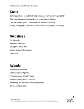 This document provides an overview of a professional development conference session on boundaries in professional and ethical practice. The session goals are to define boundaries, distinguish between boundary blurring, crossings and violations, describe types of boundaries and breaches, and identify strategies for establishing and maintaining appropriate boundaries. The agenda includes defining professional boundaries, addressing boundary breaches, and preventing violations. The document outlines principles and strategies for maintaining ethical boundaries in professional counseling relationships.