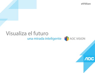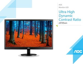 This document provides specifications for an AOC LED monitor model e970Swn. It is a 19-inch widescreen LED monitor with a resolution of 1366x768 pixels. Key features include a high dynamic contrast ratio of 20,000,000:1, 5ms response time, and connectivity options of VGA and D-sub ports. Dimensions and other technical details are provided.