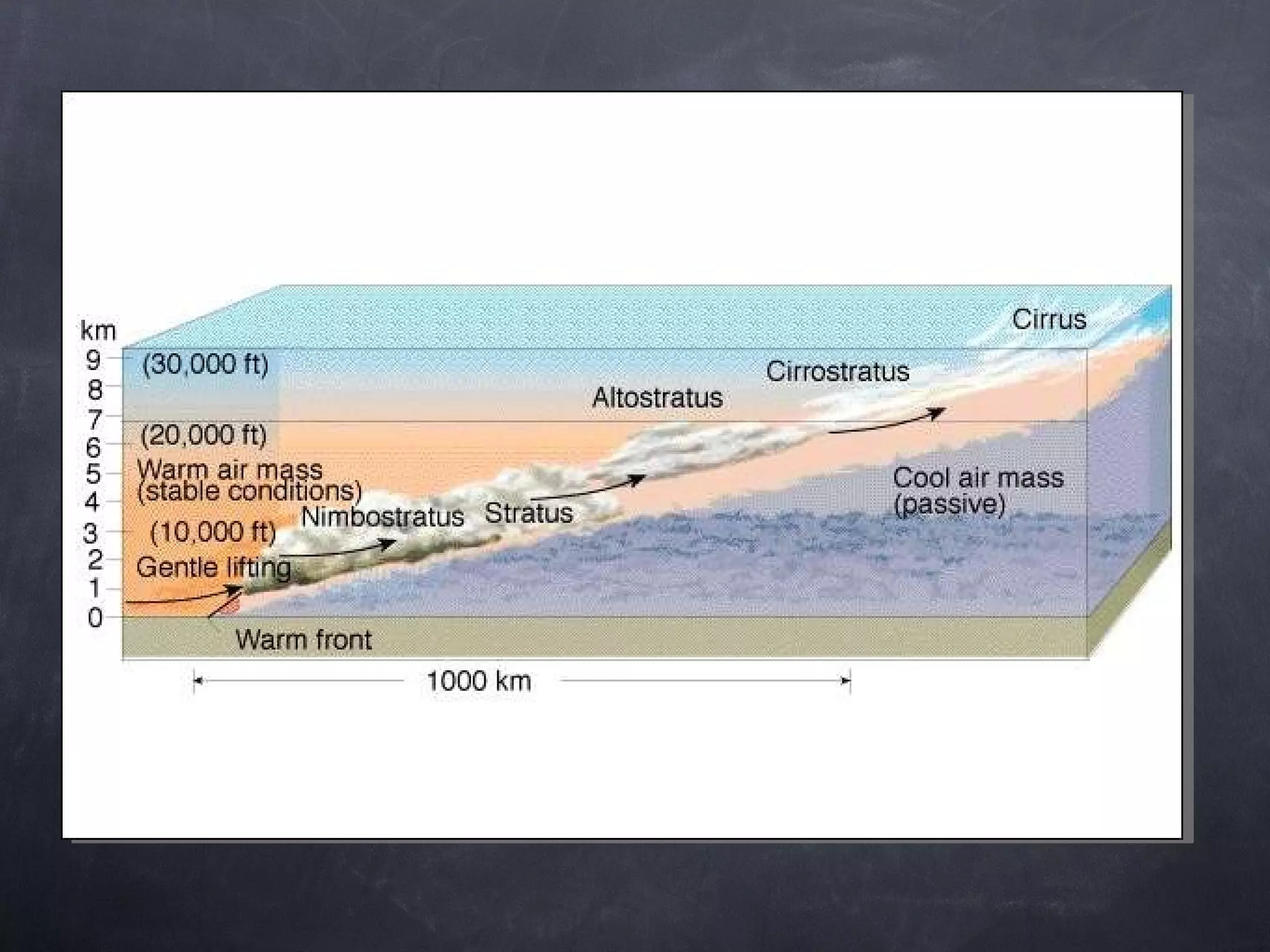 Air masses take on the characteristics of the land or water over which they form, bringing moisture and temperatures with them as they move. There are four main types of air masses in North America - polar and tropical, which form far from and near the equator, and continental and maritime, which gain moisture over land and water. Weather fronts occur when different air masses meet, and can be cold, warm, or stationary. Cold fronts move quickly and bring rising air, condensation, and storms, while warm fronts rise more slowly and bring steady precipitation.