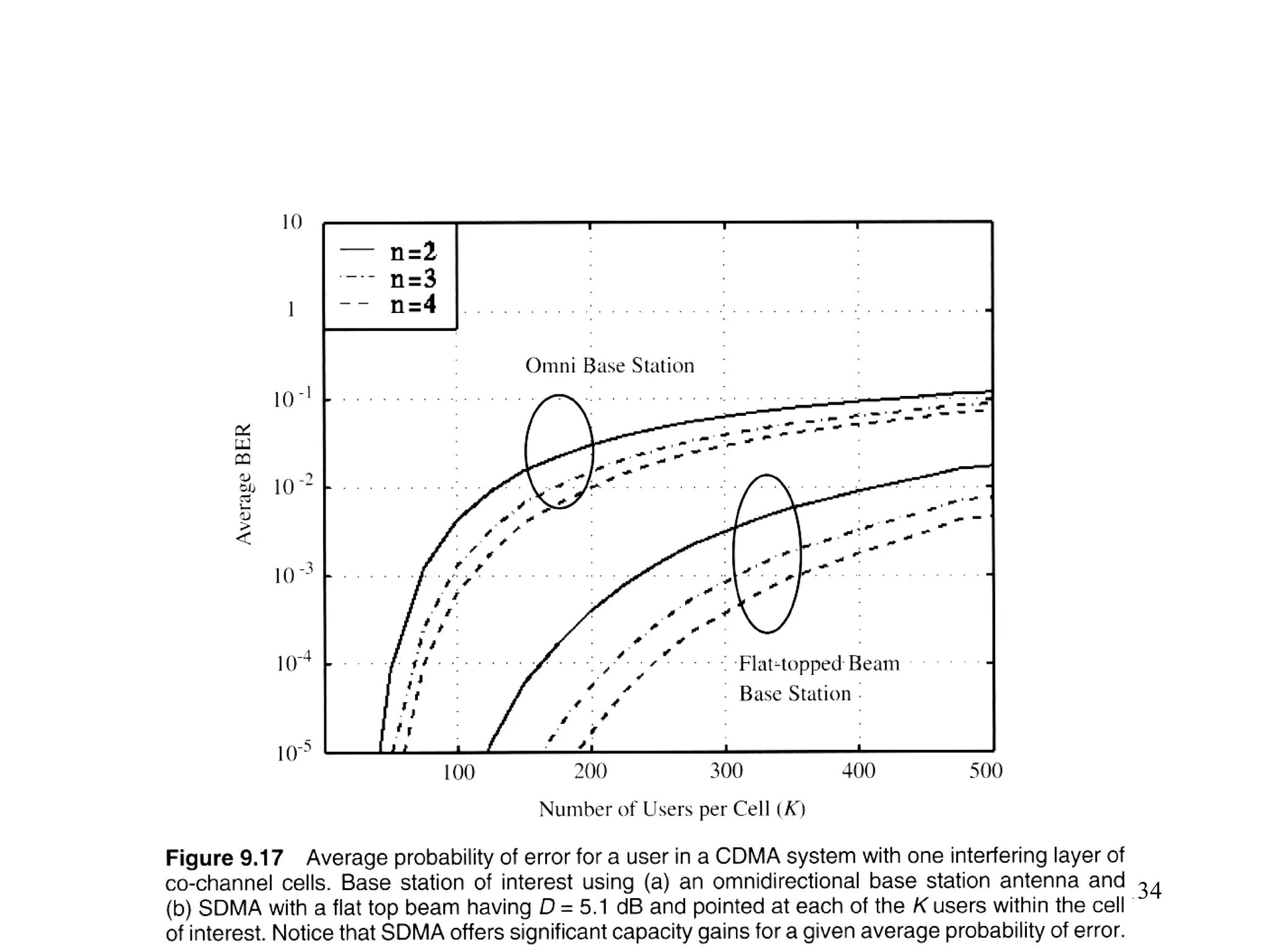 Example 9.9 IfW=1.25MHz, R=9600bps, and a minimum acceptable is found to be 10dB, determine the maximum number of users that can be supported in a single-cell CDMA system using (a) omni- directional base station antennas and no voice activity detection, and (b) 3-sectors at the base station and activity detection with =3/8. Assume the system is interference limited. The total number of users is given by 3N s , since three sectors exist Within a cell; therefore N=3*35.7=107users/cell. Solution to Example 9.9 (a) using Eq. (9.31) (b) Using Eq. (9.33) for each sector we can find N s