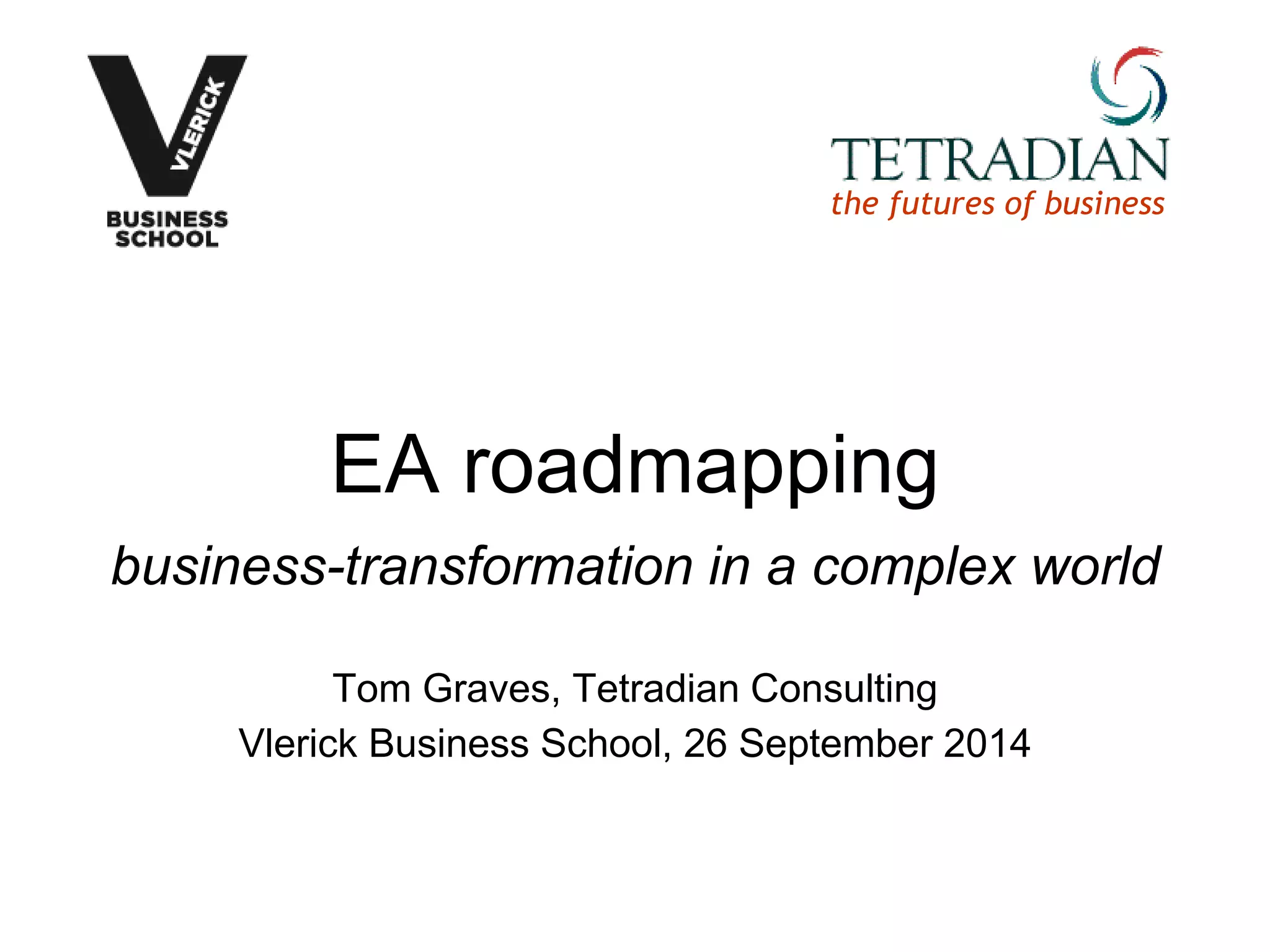 The document discusses enterprise architecture (EA) roadmapping and business transformation. It addresses several topics: where to start roadmapping priorities; partitioning work; keeping projects on track; best practices; and real-world examples. Diagrams from The Open Group Architecture Framework (TOGAF) are presented and clustering models and maturity models are proposed for managing interdependencies between projects and assessing organizational readiness for change. The presentation emphasizes that EA roadmaps are complex and nonlinear in reality.