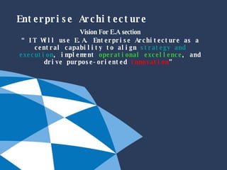 Enterprise architecture provides a holistic view of an organization by mapping the relationships between business strategy, processes, information, applications, and technology. It helps align IT with business goals and drive innovation while ensuring operational excellence. The enterprise architecture framework includes perspectives on the vision, objectives, policies, roles and more to understand how the organization functions at both the current and future states.