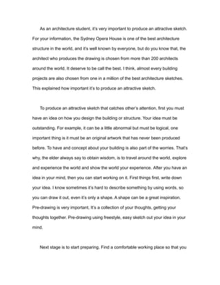 This document is a 778-word essay about producing an attractive architecture sketch. It discusses that having an original and outstanding idea is important, as well as preparing materials and tools. It recommends starting with light sketches and pre-drawing to develop the idea. Details like adding scales, measuring, and refining lines are important to perfect the sketch. Producing an attractive sketch takes a long time, patience, effort, and learning from mistakes.