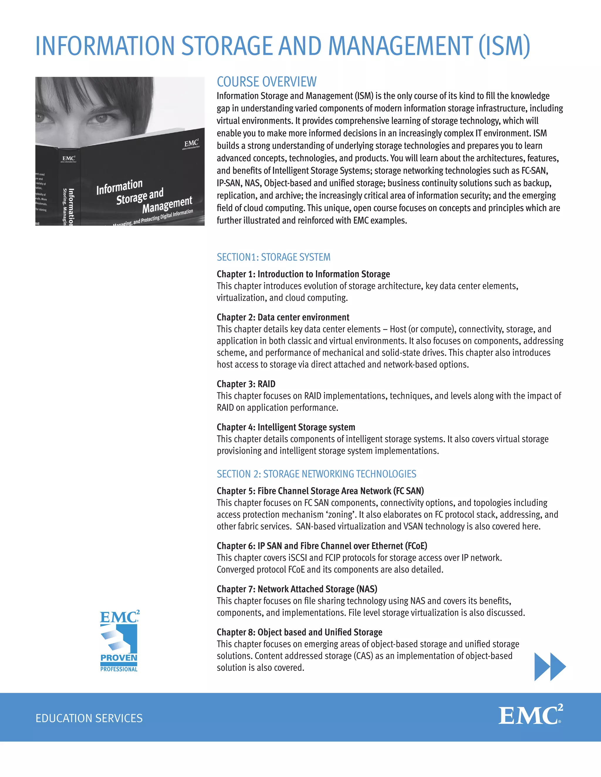 The Information Storage and Management (ISM) course offers a comprehensive understanding of modern information storage infrastructure, covering topics such as storage technologies, networking solutions, and cloud computing. The curriculum includes insights into intelligent storage systems, RAID techniques, and business continuity strategies while addressing the critical role of information security. The course is recommended for senior undergraduates and postgraduates in computer science, engineering, and information technology, aiming to equip students with practical knowledge applicable to business decisions.