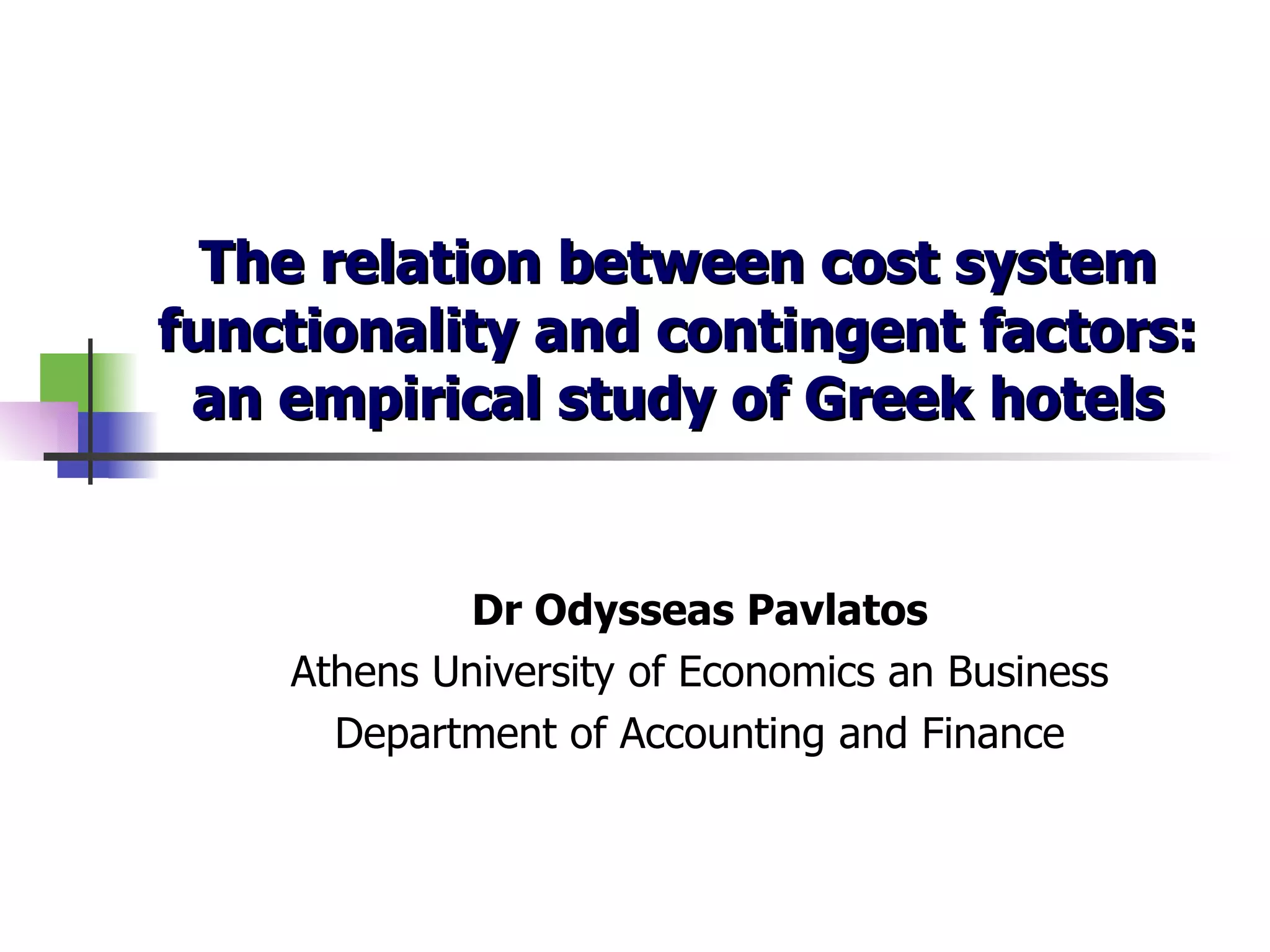The study investigated associations between cost system functionality and contingent factors in Greek hotels. A survey of 100 hotels found their cost systems had low functionality. Cost system functionality was positively associated with low cost strategy and extent of cost data use. Size, competition, number of services, and use of innovative accounting tools were not significant factors. The study provides initial evidence on cost systems in hospitality and adds to contingency theory literature, but was limited by sample size and being cross-sectional. Future research could examine additional variables and associations with performance.