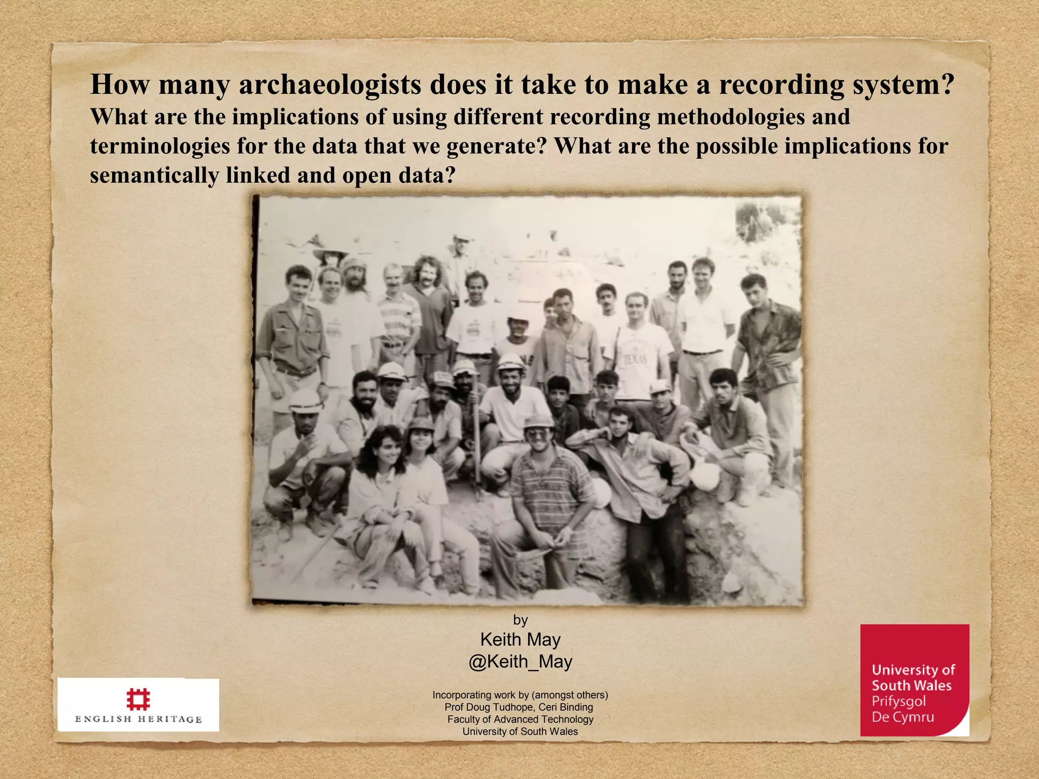 This document discusses different archaeological recording methodologies and their implications for linked open data. It provides examples of recording systems from the UK, Germany, Italy, Turkey and Israel. While the systems vary in their specific terminology, they generally conceptualize common relationships like stratigraphic units, finds, and phases. The document argues these commonalities allow data from different systems to be semantically linked to enable cross-searching for broader research insights. However, challenges remain around developing shared technologies and willingness to openly share archaeological data.