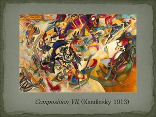 The document discusses several abstract artists and their philosophies of abstractionism. It explains that abstract artists like Kandinsky, Mondrian, and O'Keeffe shifted away from representational art to focus on expressing emotions and revealing spiritual truths through arrangements of color, line, and form. The document also notes that abstractionism developed from earlier movements like Impressionism and Cubism and that abstract artists believed their work was a process, not an end goal, to uncover deeper understandings of the universe.