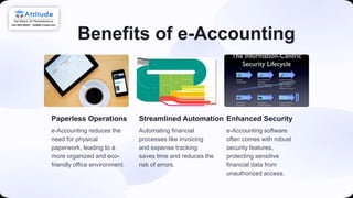 E-accounting is an electronic approach to managing financial records that enhances efficiency, accuracy, and decision-making for businesses. It offers benefits such as paperless operations, automated processes, enhanced security, and integration capabilities, while its implementation requires careful planning, training, and ongoing optimization. Future trends include the integration of AI, blockchain for security, and increased adoption of cloud-based solutions.