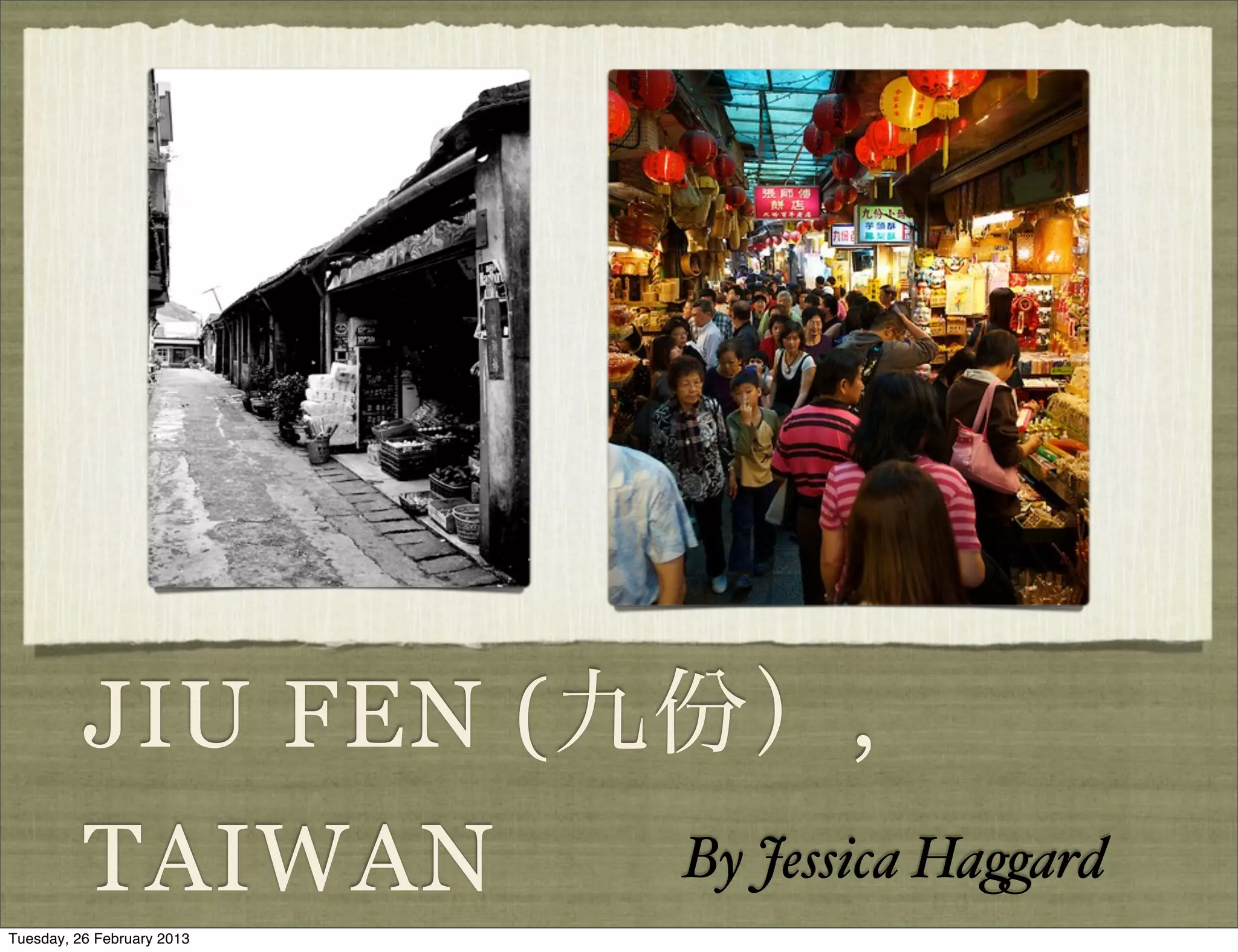 The document provides information about Jiu Fen, a former gold mining town in Taiwan. It describes how Jiu Fen got its name and originated as a gold mining town under Japanese occupation. After the gold ran out, it was deserted until being revived as a tourist destination after being featured in popular movies. While tourism has helped the local economy, some argue that over-commercialization threatens Jiu Fen's small-town charm by prioritizing the needs of visitors over local residents and culture.