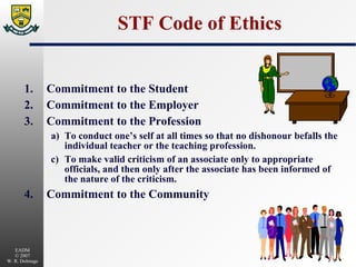 1. The document discusses teachers' roles, responsibilities, and codes of ethics. It outlines teachers' commitments to students, employers, the profession, and community. It also discusses administering medication, reporting child abuse, and what constitutes a "child in need of protection".