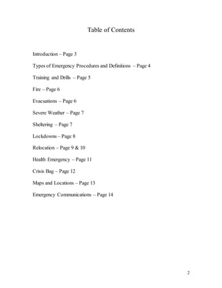 The Eagle Ridge Elementary School Emergency Operations Plan outlines procedures for various emergency situations. In the event of an emergency, staff should dial 911 and the main office number to make an all-call announcement. The plan details procedures for fires, severe weather, evacuations, lockdowns, health emergencies, and relocation. Staff are trained through regular drills on fire, weather, evacuation and lockdown procedures. The plan also includes maps of the school, locations of crisis bags, and templates for communicating with parents during emergencies.