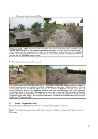 This document summarizes a flood mitigation project in Chikwawa, Malawi led by Eagles Relief and Development Programme. Flooding in the area has worsened in recent years, destroying crops, livestock, property and sometimes claiming lives. The project aims to reduce flooding through river rehabilitation, reforestation, and improved land management. Initial efforts from 2003-2005 in 5 villages had success with storm drains and woodlots. In response to major 2005/2006 floods, the project expanded to 14 villages and took a multi-sectoral approach involving advocacy, community mobilization, and forming a government task force. Achievements include community initiatives like dyke construction, dams, and re-routing the river, as well as