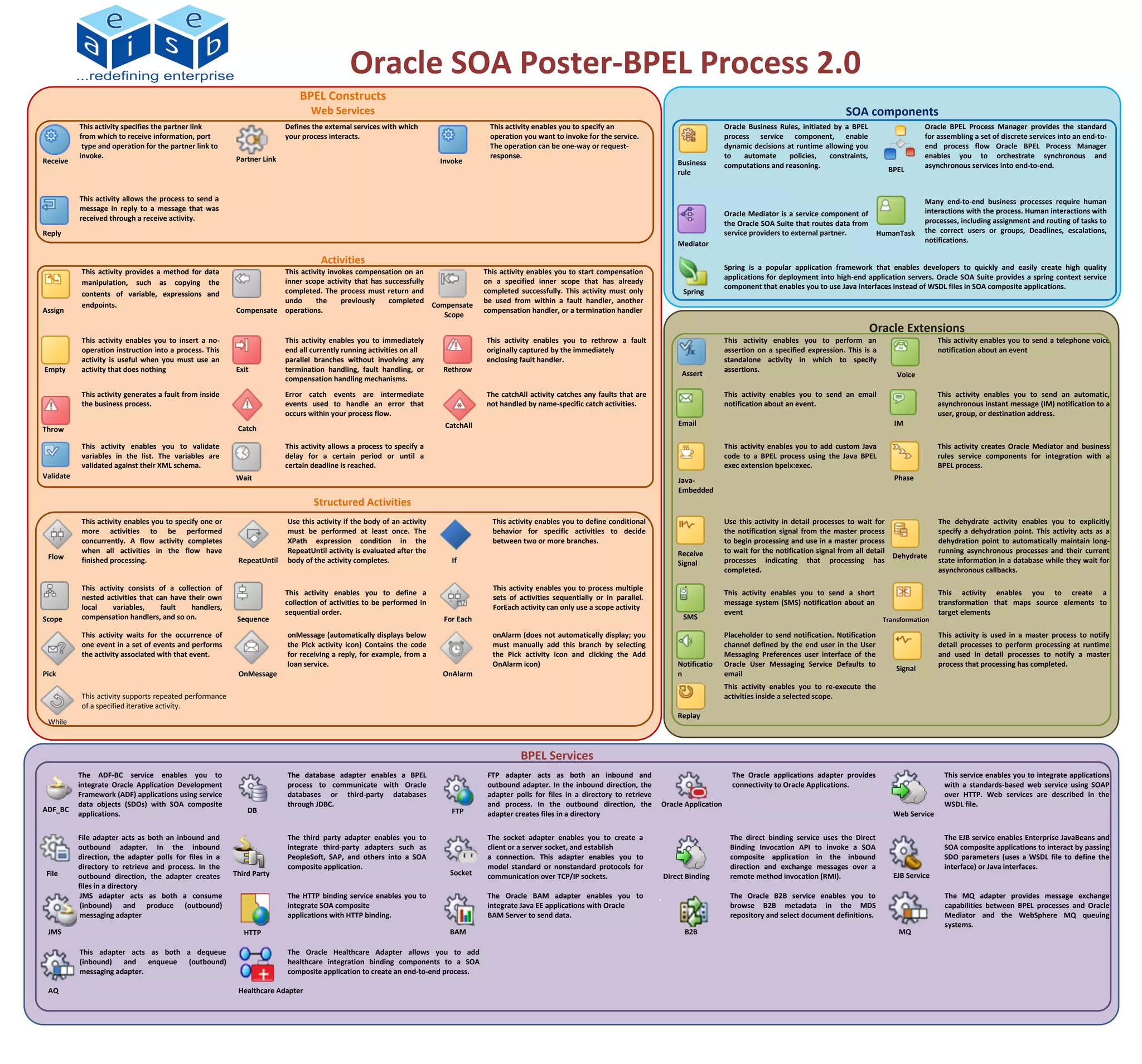 The document provides an overview of BPEL constructs and activities used to define business processes. It describes common activities like receive, invoke, reply, throw and various structured activities to define control flow. It also lists some key SOA components that can be initiated from BPEL processes like human tasks, business rules and mediation. Finally, it outlines various adapters that enable integration of applications and services into BPEL processes.