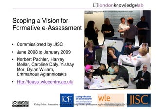 The document outlines the scoping vision for formative e-assessment, detailing methodologies like desk research and collaborative workshops aimed at bridging theory and practice. It emphasizes the importance of formative assessments using digital tools to create feedback loops and improve instructional decisions based on student performance. Additionally, it discusses various case studies and patterns developed through participatory workshops to enhance learning experiences.