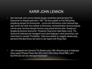 John Lennon, lahir di Liverpool pada 9 Oktober 1940, adalah seorang musisi yang terkenal sebagai anggota The Beatles, yang dibentuk pada tahun 1960. Setelah bubarnya band tersebut, ia melanjutkan karier solo hingga meninggal dunia akibat pembunuhan pada 8 Desember 1980. Kehidupan dan karya Lennon meninggalkan dampak besar pada dunia musik dan budaya.