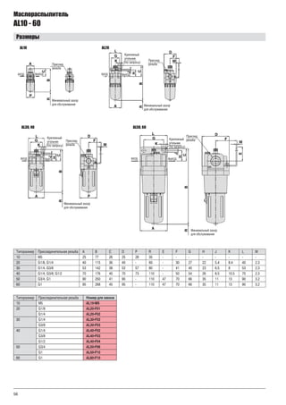 Документ описывает характеристики и спецификации масляных распределителей серии al10 - al60 для пневмосистем, включая данные о присоединительных размерах и рабочих температурах. Указаны рекомендуемое масло, минимальные и максимальные давления, а также материалы корпуса и резервуара. Кроме того, приведены параметры установки и заказа для различных типоразмеров.