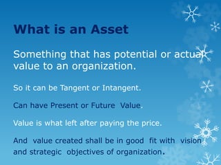 The document discusses enterprise asset management. It defines assets and their nature, including human, financial, information, and physical assets. Asset management aims to optimize asset performance, risks, and costs over their lifecycles to achieve organizational goals. The document outlines key elements of asset management systems, including policy, strategy, objectives, plans, enablers and controls, implementation, and performance assessment. It discusses standards like ISO 55000 that provide guidance for establishing effective asset management.
