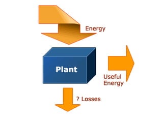 This document discusses energy auditing and management. It defines an energy audit as the systematic collection and analysis of energy data to identify conservation opportunities. The objectives are to identify current energy usage and costs, assess consumption patterns, relate usage to production, highlight inefficiencies, and set savings targets. An energy audit process includes a preliminary audit using existing data to establish a baseline and identify focus areas, followed by a more detailed audit using advanced instrumentation to account for 95% of energy usage and develop engineering recommendations. The audit outputs include an assessment of management structures, a need for metering and monitoring, and an action plan prioritizing energy projects and setting budgets for savings.