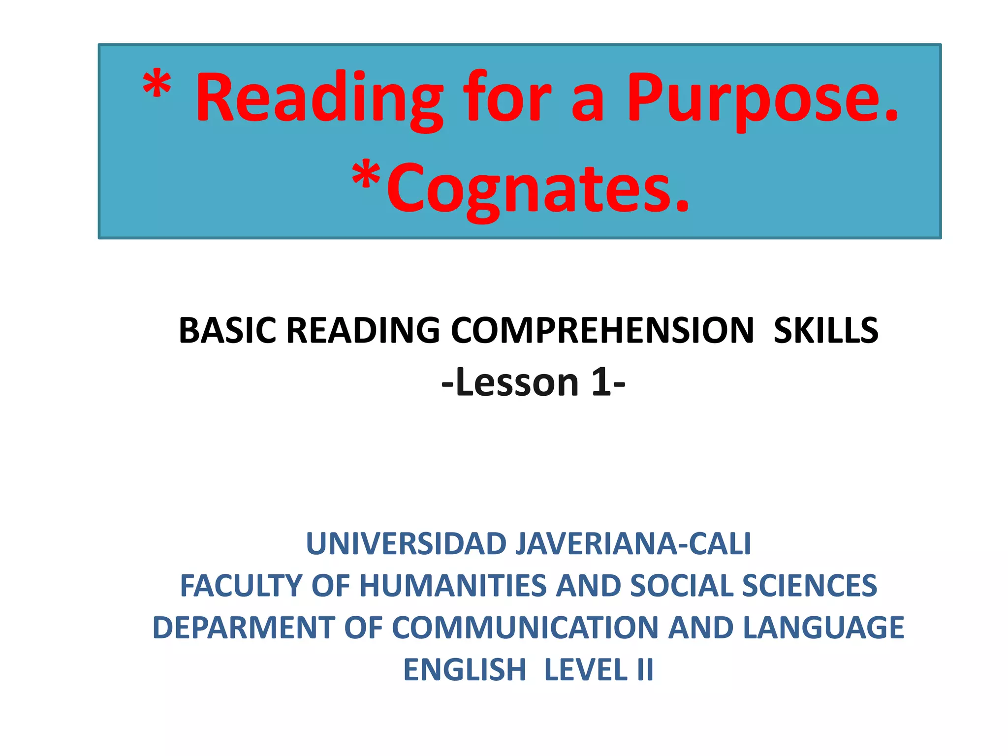 This document discusses reading skills and provides information about cognates. It defines cognates as words in two languages that have a common origin and similar meaning and spelling. The document notes that cognates can help with reading comprehension but that meanings may differ over time. Examples of cognates like objective/objective and difficult/dificil are provided, as well as a warning about false cognates that look similar but mean different things.