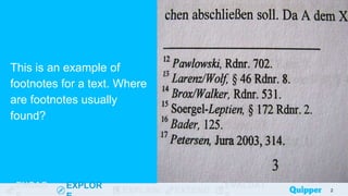 This document provides information on citing sources using APA and MLA citation styles. It discusses the different elements of in-text citations, such as short vs long quotes. It also covers formatting for footnotes and endnotes in both styles, including placement, structure, and purpose (providing supplemental information vs copyright). The key differences between APA and MLA styles are discussed, such as inclusion of author names in citations and placement of notes (footnotes in APA, endnotes in MLA). The goal is to teach writers how to properly cite sources using these standardized styles.