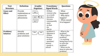 The document discusses the importance of understanding text structure in academic writing, highlighting various structures such as chronological, cause and effect, problem and solution, and compare and contrast. It outlines specific objectives for differentiating academic language from social language and lists strategies for improving academic writing skills. The text emphasizes that recognizing text structures can enhance comprehension, help organize information, and facilitate connections between key concepts.
