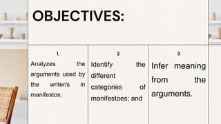 The document discusses analyzing arguments used in manifestos. It defines a manifesto as a document that publicly declares a position and can advance ideas, opinions, or a plan of action on topics like art, literature or politics. It is generally written on behalf of a group. The document notes that manifestos typically aim to convince readers of a concept and bring about change by providing logical reasons and arguments. It stresses the importance of understanding the arguments presented in a manifesto in order to grasp the meaning and perspective the author intends to convey.