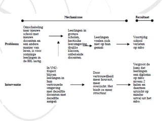 This document discusses explanatory evaluation as a methodology to better understand the effects of policy interventions. Explanatory evaluation aims to determine how and why interventions work (or not), providing a finer level of detail than traditional impact evaluations. It involves reconstructing the underlying theory of the intervention, developing hypotheses about change mechanisms, and testing these hypotheses through field studies with different stakeholders. The goal is to gain insights into what works for whom and in what contexts to inform future policy. The methodology is proposed as a way to complement impact evaluations and provide more explanatory power for policymakers.