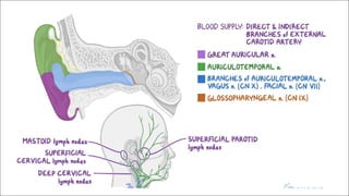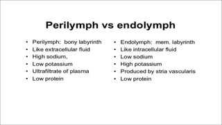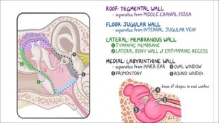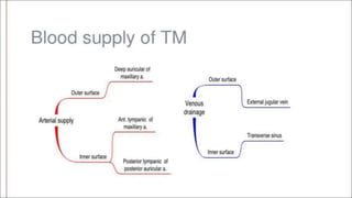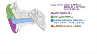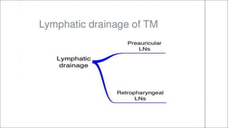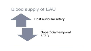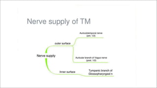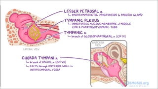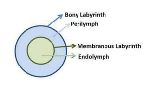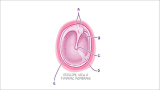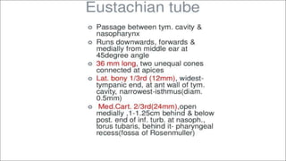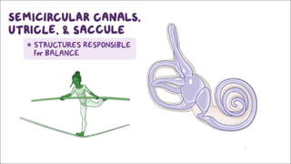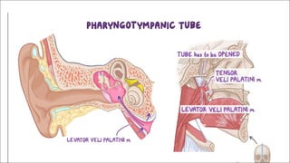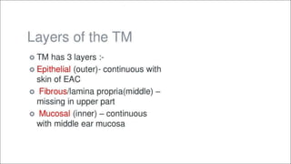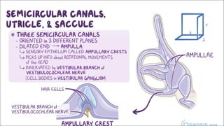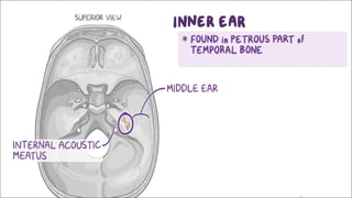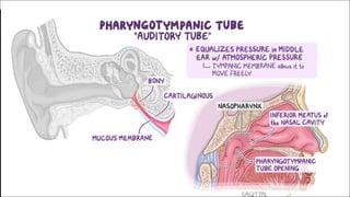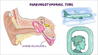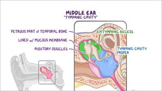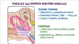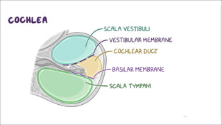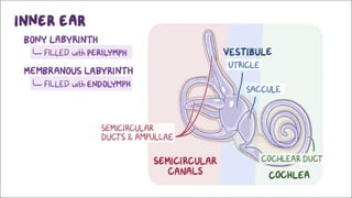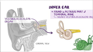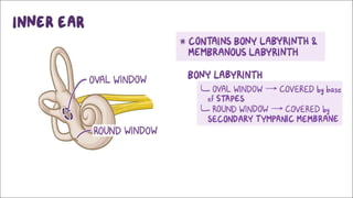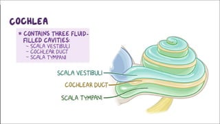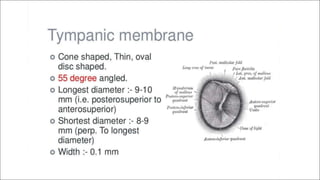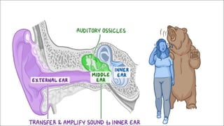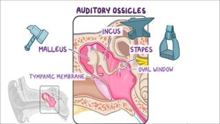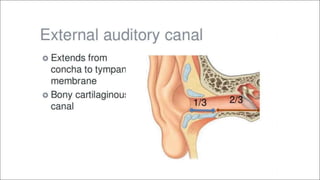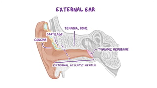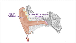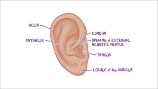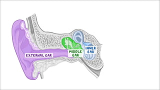 The ear has three main parts: the outer, middle, and inner ear. The tympanic membrane, also known as the eardrum, separates the outer and middle ear. The spiral organ of corti in the inner ear converts sound vibrations into electrical impulses that the brain interprets as sound.