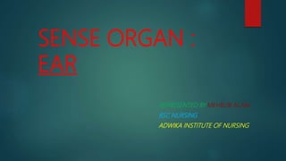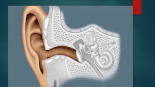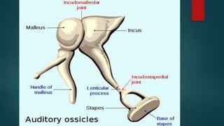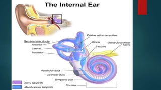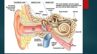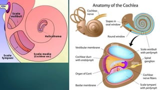 The document provides an overview of the human ear, detailing its roles in hearing and balance, and its three main parts: external, middle, and inner ear. Key components include the tympanic membrane, ear ossicles, vestibular apparatus, and cochlea, which are essential for sound transduction and maintaining equilibrium. The cochlea contains the organ of Corti, responsible for the perception of sound, and is innervated by the cochlear division of the eighth cranial nerve.