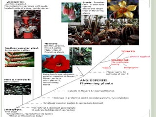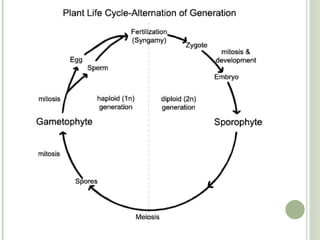 The document discusses evolutionary trends in plants, including their transition from aquatic to terrestrial environments. Early plants included bryophytes. Later plants evolved vascular tissue to transport water and nutrients, a waxy cuticle to prevent water loss, and stomata to regulate gas exchange. Seed plants further evolved seeds and pollen for protection and dispersal of reproductive cells on land. Throughout plant evolution, the sporophyte generation became larger and more prominent than the gametophyte generation.