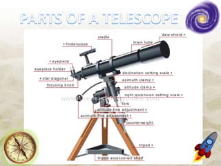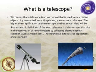 - Telescopes allow viewing of distant celestial objects like stars, planets, and galaxies. The Hubble Space Telescope is the most advanced telescope currently in use.