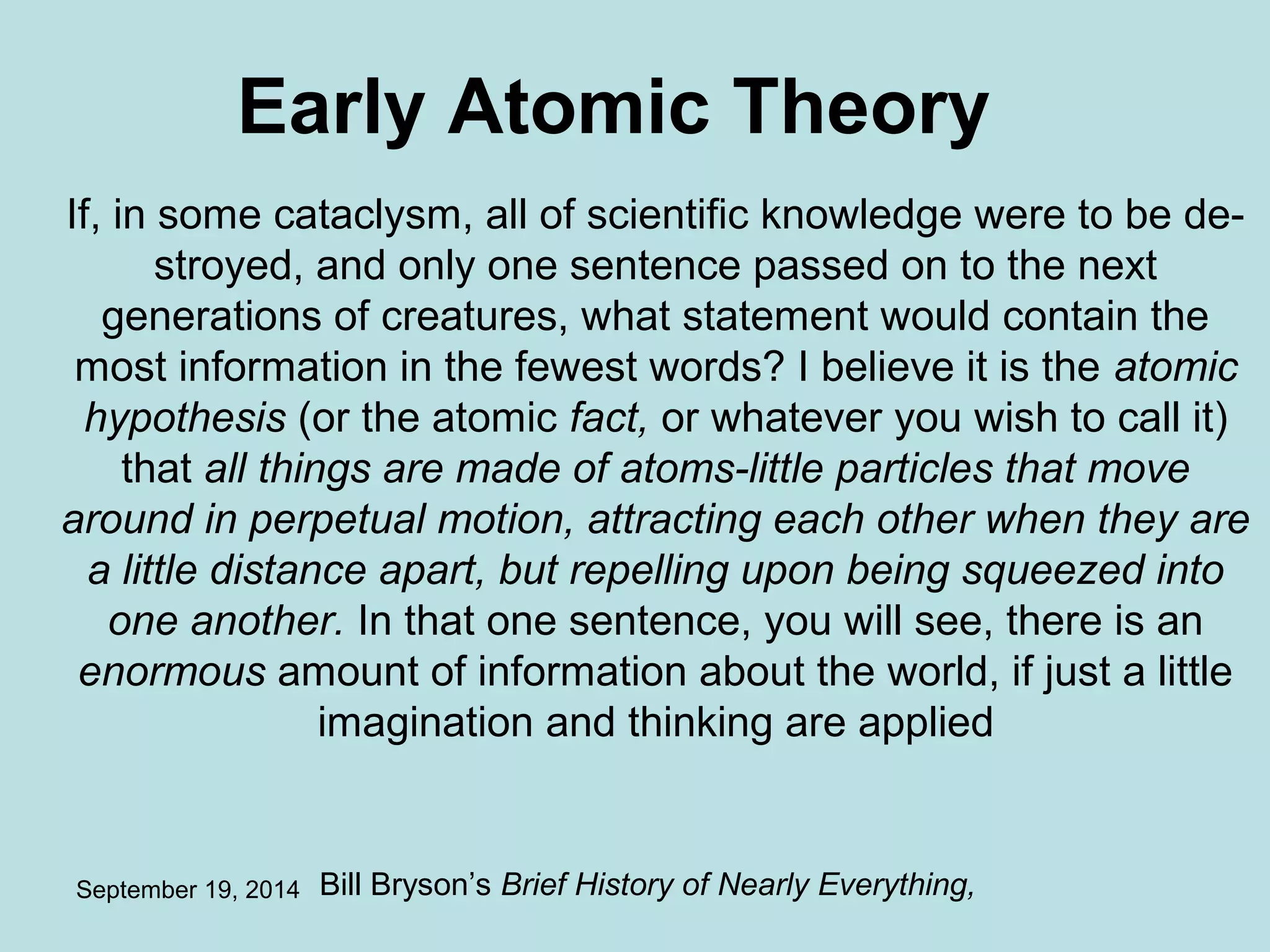 - Early atomic theory proposed that all things are made up of tiny particles called atoms that are constantly in motion, attracting each other at distances but repelling when squeezed together. This single sentence contains a vast amount of information about the structure of matter.