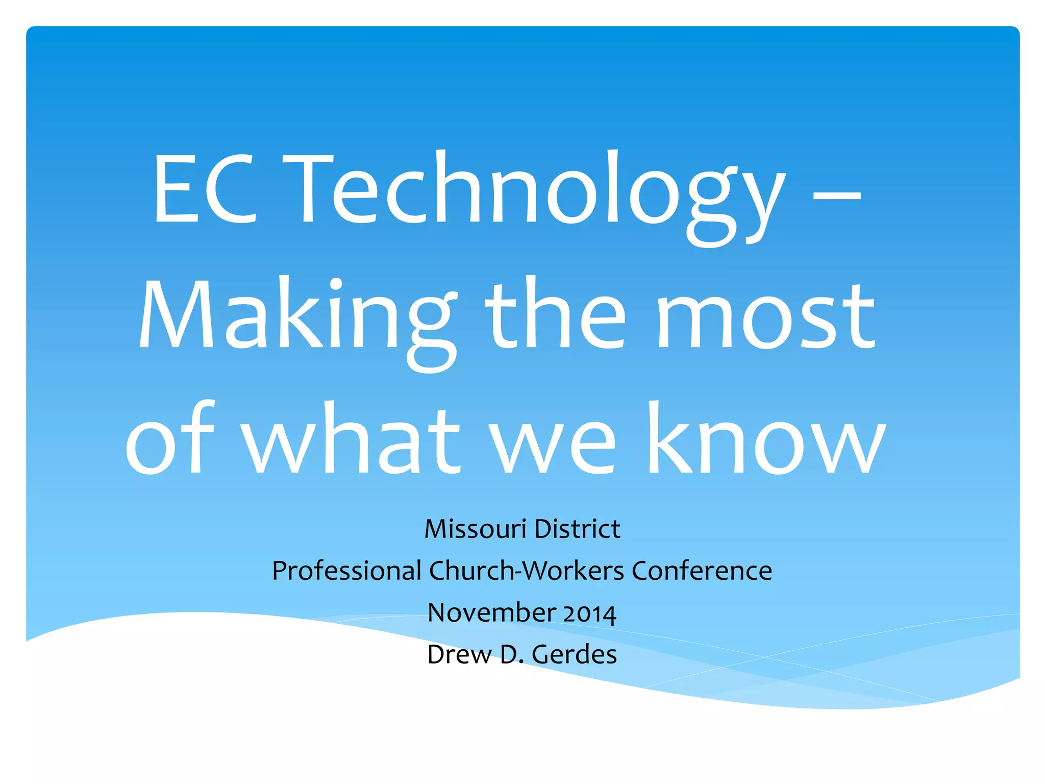 This document summarizes a presentation about using technology effectively in early childhood education. It discusses how technology is already being used by young children and in classrooms. While research is still being done on the impacts of technology, tools like computers, websites, interactive whiteboards, tablets and iPads can be used to support learning if implemented intentionally and in moderation. The presentation provides examples of developmentally appropriate uses of technology and encourages educators to continue learning about integrating technology.