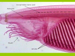 The phylum Chordata is characterized by four defining features in its members: 1) a dorsal, hollow nerve cord, 2) a dorsal notochord to support the body, 3) a post-anal tail at some stage of development, and 4) seven pharyngeal clefts at some stage of development. The phylum is divided into three subphyla, with the subphylum Vertebrata further divided into 10 classes that include mammals, birds, reptiles, amphibians, and various fish classes.