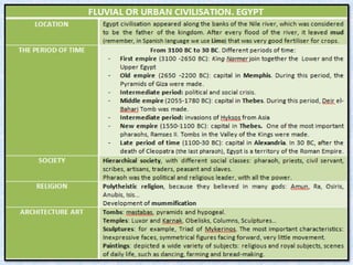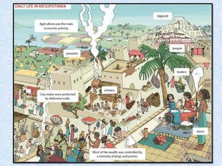 The document provides information about early civilizations in Egypt and Mesopotamia. It begins by introducing the topic of early civilizations that will be covered in Unit 2. It then discusses some key characteristics of early civilizations in general, including their origins along major river valleys, hierarchical social structures, use of irrigation, development of urban centers, and invention of writing systems. The document goes on to provide more specific details about early civilizations in Mesopotamia and Egypt, including their social structures, religious beliefs, and some of their major empires and accomplishments in architecture, art, literature, science and other areas.