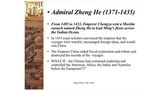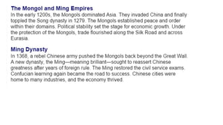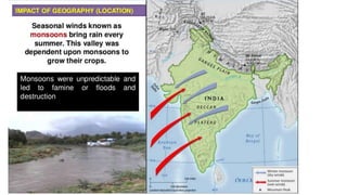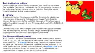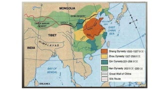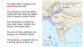 Early civilizations arose in India and China along major river valleys. In India, the earliest civilization flourished for about 1000 years along the Indus River before vanishing. It included urban planning and a written language. Chinese civilization first developed along the Huang He River, with the Shang Dynasty establishing a hierarchical society led by a king. Confucianism and Daoism later emerged as dominant philosophies. The Mughal Empire rose to power in India and made significant cultural contributions, while European traders gradually increased their influence in both regions over this period.