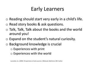This presentation discusses early literacy and how to help young students. It recommends reading to children from an early age and talking about the books to expand their background knowledge. Teachers can help students decode words and make connections to improve comprehension. When selecting texts, factors like readability, interest, and visual support should be considered. Teachers can use assessments to understand students and help them become independent thinkers. Feedback is requested using the questions provided.