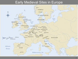 Early Medieval Art developed after the fall of the Western Roman Empire and preceded the Romanesque period of the 11th century. Christian monks played a key role in preserving art by creating illuminated manuscripts. Northern European peoples like the Merovingians and Anglo-Saxons developed artistic styles using interlaced designs and abstract animal imagery. Under Charlemagne's empire, Carolingian art revived Roman forms and focused on book illuminations. Ottonian art flourished in Germany with architectural styles influenced by Byzantium and illuminated manuscripts featuring linear figures.