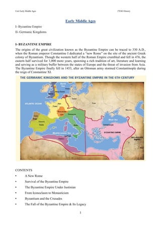 The document provides an overview of the Early Middle Ages in Europe, focusing on the Byzantine Empire and Germanic Kingdoms. It can be summarized as follows: