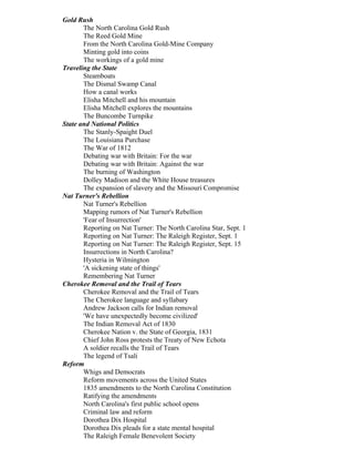 - Other events and developments included the North Carolina gold rush, internal improvements like canals, the War of 1812, Nat Turner's Rebellion, Cherokee Removal, and political reforms in the 1830s.
