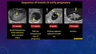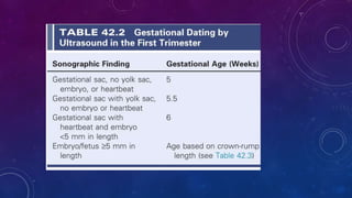 This document provides guidelines for an early ultrasound exam including indications, patient history, structures to visualize, and sonographic timeline. It details how to estimate gestational age from 5-6 weeks by measuring the mean sac diameter or identifying gestational sac contents. From 6 weeks until the end of the first trimester, gestational age correlates with the crown-rump length of the embryo or fetus. The document also provides guidelines on evaluating heart rate, yolk sac size, and identifying subchorionic hematomas.