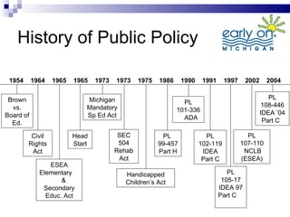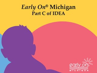 The document outlines the history and framework of Early On, a statewide system in Michigan offering early intervention services under Part C of the Individuals with Disabilities Education Act (IDEA). It aims to support infants and toddlers with developmental delays or established conditions by enhancing their development and family capacity through various health, educational, and social services. The structured process includes referral, evaluation, Individualized Family Service Plan (IFSP) meetings, and transition planning to ensure continued support as children grow.