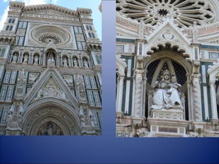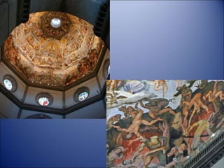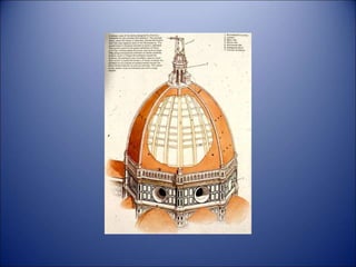 The document provides an overview of early Renaissance architecture in Italy. It discusses how the Renaissance began as dissatisfaction with medieval life led to new discoveries inspired by ancient Roman and Greek architecture. Filippo Brunelleschi was a pioneering architect of the early Renaissance, designing the dome of Florence Cathedral and rediscovering linear perspective. Other architects like Alberti and Bramante further developed Renaissance styles and proportions based on classical orders, influencing buildings like churches, palaces, and piazzas across Italy.