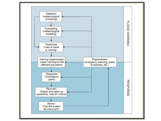 The document discusses early warning systems (EWS) for disaster management, emphasizing their importance in timely communication about extreme events like earthquakes and floods to protect lives and property. It outlines the features of effective EWS, including community engagement and the integration of technology, such as seismic monitoring and flood sensors. Additionally, it highlights specific applications, such as earthquake early warning systems and community-based flood warnings in sensitive regions like the Hindu Kush Himalayas.