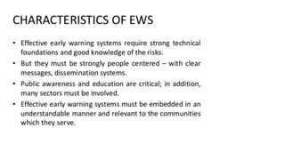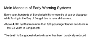 Early warning systems aim to avoid or reduce the impact of natural hazards by generating and disseminating timely warnings. In Bangladesh, hundreds of fishermen die at sea each year from disasters without warning. Early warning systems have significantly reduced deaths from disasters in Bangladesh by allowing for evacuation and prepositioning of response efforts. Key stakeholders in Bangladesh's early warning system include government agencies, NGOs, and community groups, but there is still work to be done to strengthen last mile warning dissemination and cross-border coordination.