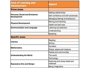 This document outlines the end of year expectations for children in Reception class. It discusses the Early Years Foundation Stage framework which sets standards for early years providers. It describes the seven areas of learning that children are assessed against, including personal/social development, communication/language, physical development, literacy, maths, understanding the world, and expressive arts/design. It provides examples of common struggles children have with early learning goals in literacy, communication/language, and maths, and suggestions for what teachers can do to support children's learning in these areas.