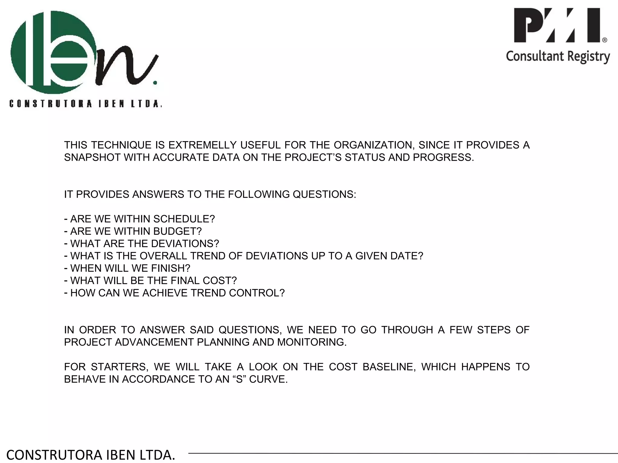 This document discusses earned value management (EVM) and added value analysis for construction projects. It explains that EVM provides accurate data on a project's status and progress by answering questions about schedule, budget, deviations, trends, and final costs. EVM involves comparing the predicted value, actual costs, and added value curves over time to analyze performance. By jointly analyzing all three values, important insights can be gained about whether the project is on schedule and on budget. Graphing the curves together clearly shows deviations and the overall project picture.