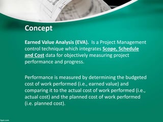 This document introduces earned value analysis (EVA), a project management technique that integrates scope, schedule, and cost to measure performance. It defines key EVA terms like budgeted cost of work performed, actual cost, earned value, and planned value. Metrics like cost variance, schedule variance, cost performance index, and estimate at completion are also explained. An example project is used to demonstrate how to calculate these metrics. The document proposes implementing EVA for ATCO projects by developing a module in their EIS system to track EVA parameters and metrics on a monthly basis. A plan is outlined to get feedback, train users, and start the new EVA process.